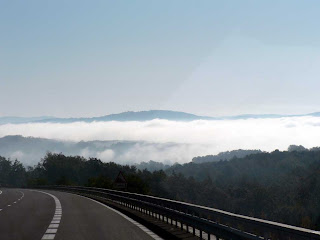 My morning constitutional was very nice, we sniffed along the river, the mist still lying low over the water, on a crystal clear start to the day. Met a little French dog, bit yappy but I stayed cool. By the time we got back, Guy had sorted out all the chores, and breakfast was ready. So we're off and its time to leave this part of France, (had to think then as there were so many people in the street speaking English) and travel south to the Mediterranean.